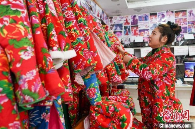 雪乡为游客拍照提供的东北大花棉袄