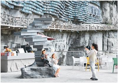 游客在棉花天坑景区悬崖书店拍照留影。韦如代摄(人民图片)
