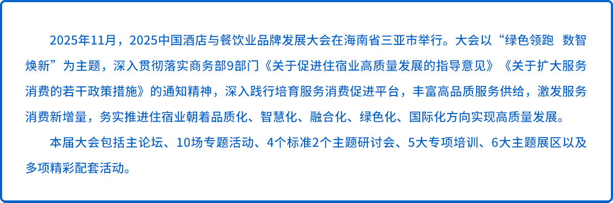 “2025中国酒店与餐饮业品牌发展大会”期间,中国饭店协会将联合香港理工大学酒店及旅游业管理学院发布《2025中国住宿业绿色发展报告》。