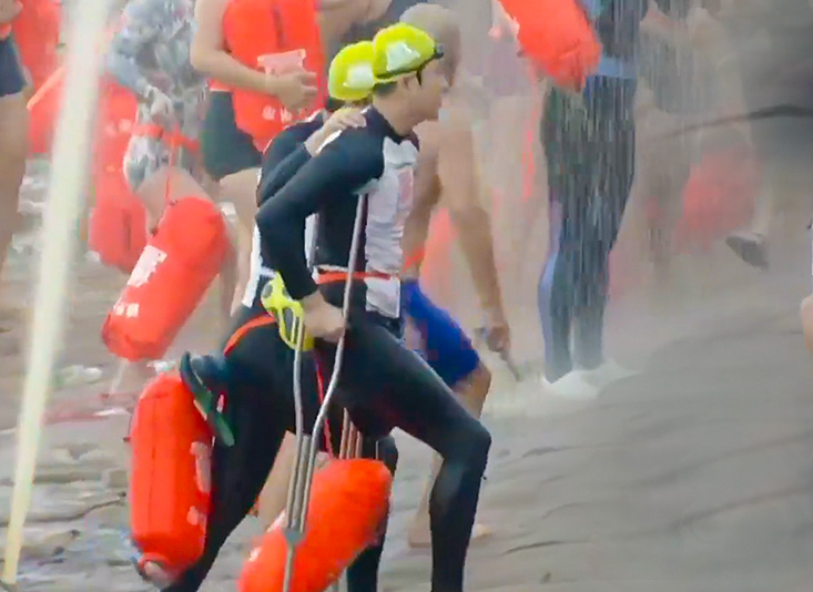 随着发令枪响,选手们开始依次下水,奋力向江对岸的终点游去。